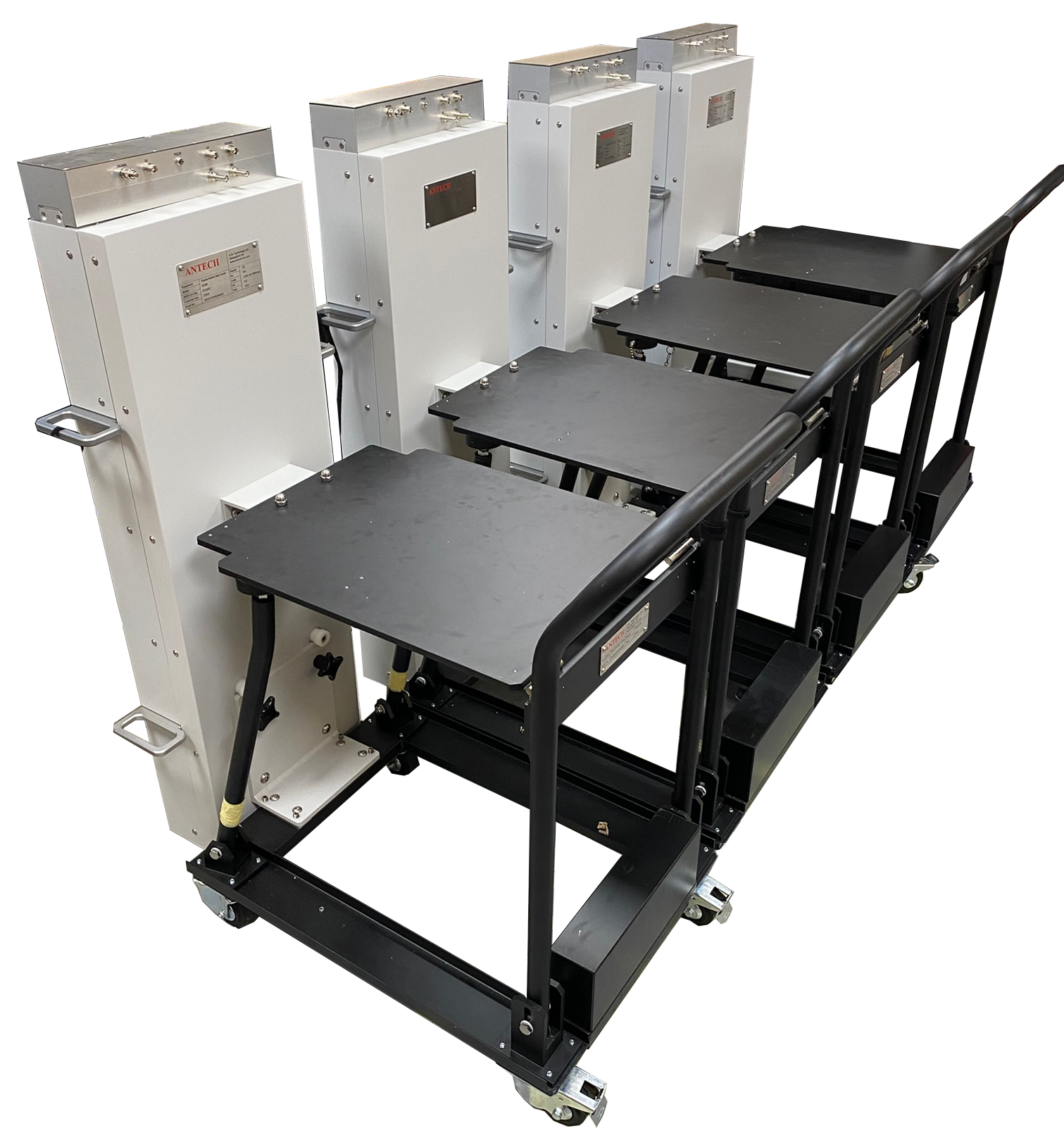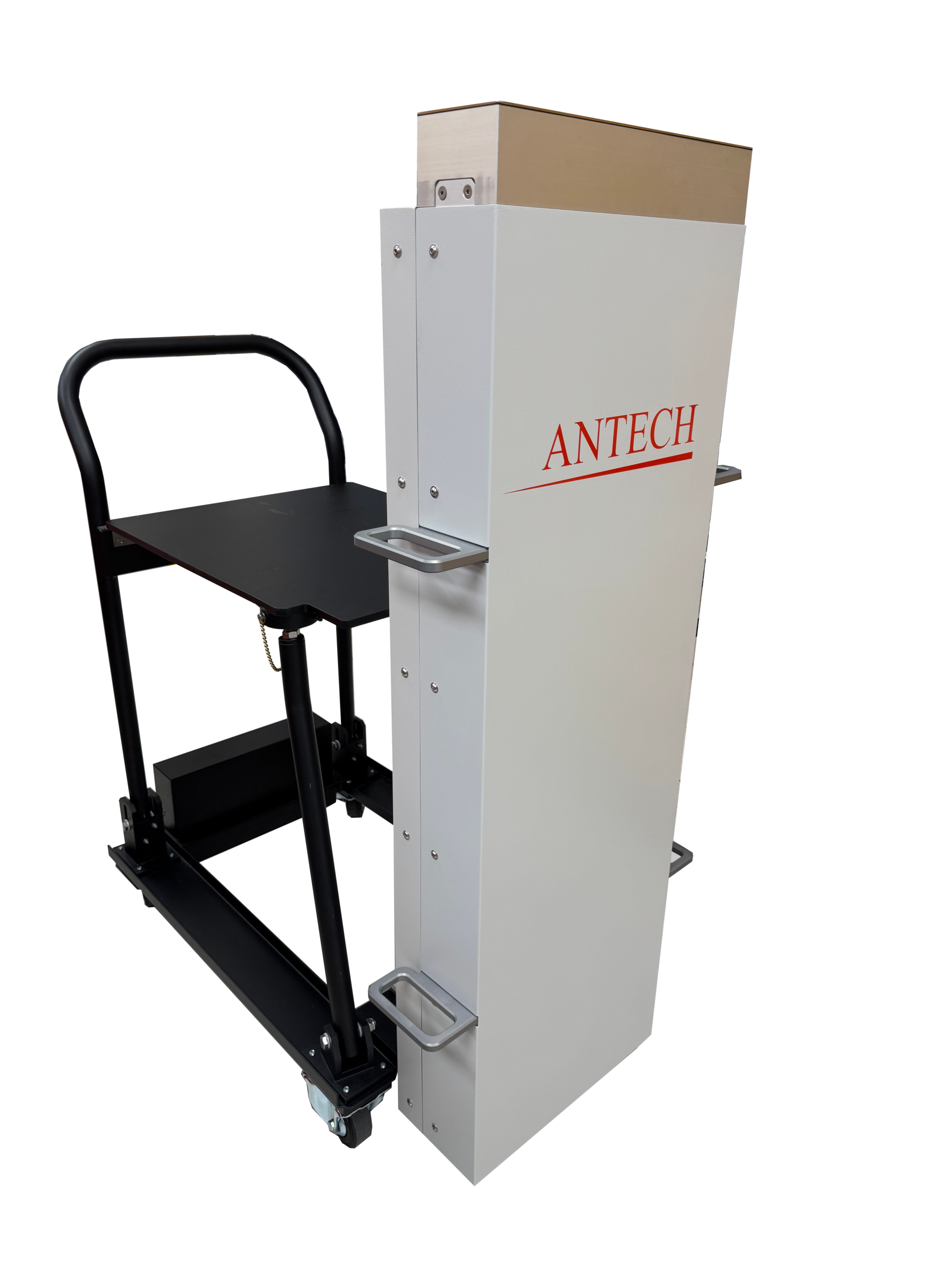 The Operator Trolley provides a mounting point for the Slab Counter and allows for easy deployment and operation. A mounting plate with quick release locator pins allows for the panel to be mounted and dismounted easily for storage and operation. The trolley features two fixed and two swivel heavy duty castors for easy positioning, and an operator shelf provides a location for the system laptop and the latest ANTECH counting electronics.